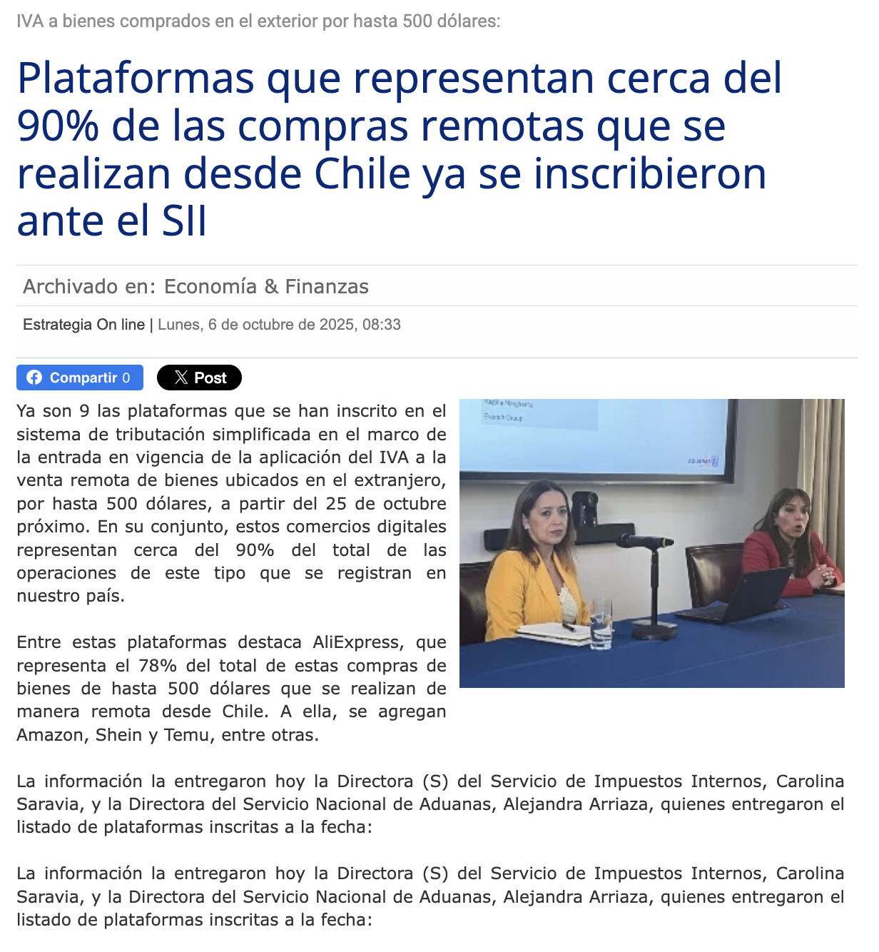 Estás en : Inicio / ADUANA INFORMA / ADUANA EN LA PRENSA [diarioestrategia.cl] Plataformas que representan cerca del 90% de las compras remotas que se realizan desde Chile ya se inscribieron ante el SII MEDIO: diarioestrategia.cl FECHA DE PUBLICACIÓN: Lunes 06 de Octubre del 2025 Artículos relacionados [RADIO COOPERATIVA] Se comenzará a... [diarioestrategia.cl] Plataformas que... MEGA: Cobrarán IVA por compras... CANAL 13: Entrevista a Alejandra... 24 HORAS: Compras internacionales...